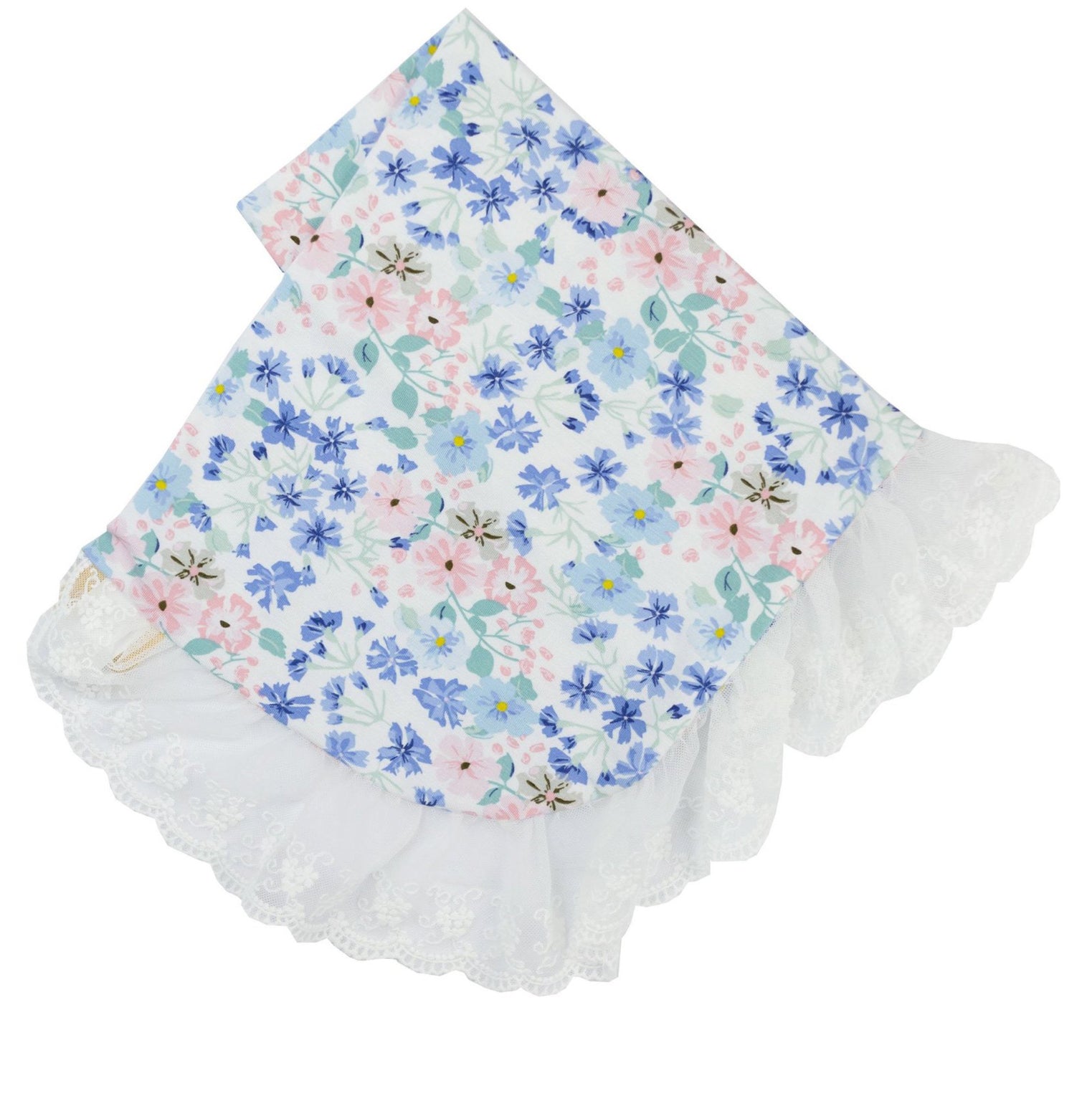 Such a sweet blanket for your baby girl! This Haute baby "Periwinkle Love" receiving blanket features tiny periwinkle blue and pastel pink flowers with mint green leaves against a white background. Blanket is trimmed with sheer lace all the way around that adds so much charm.